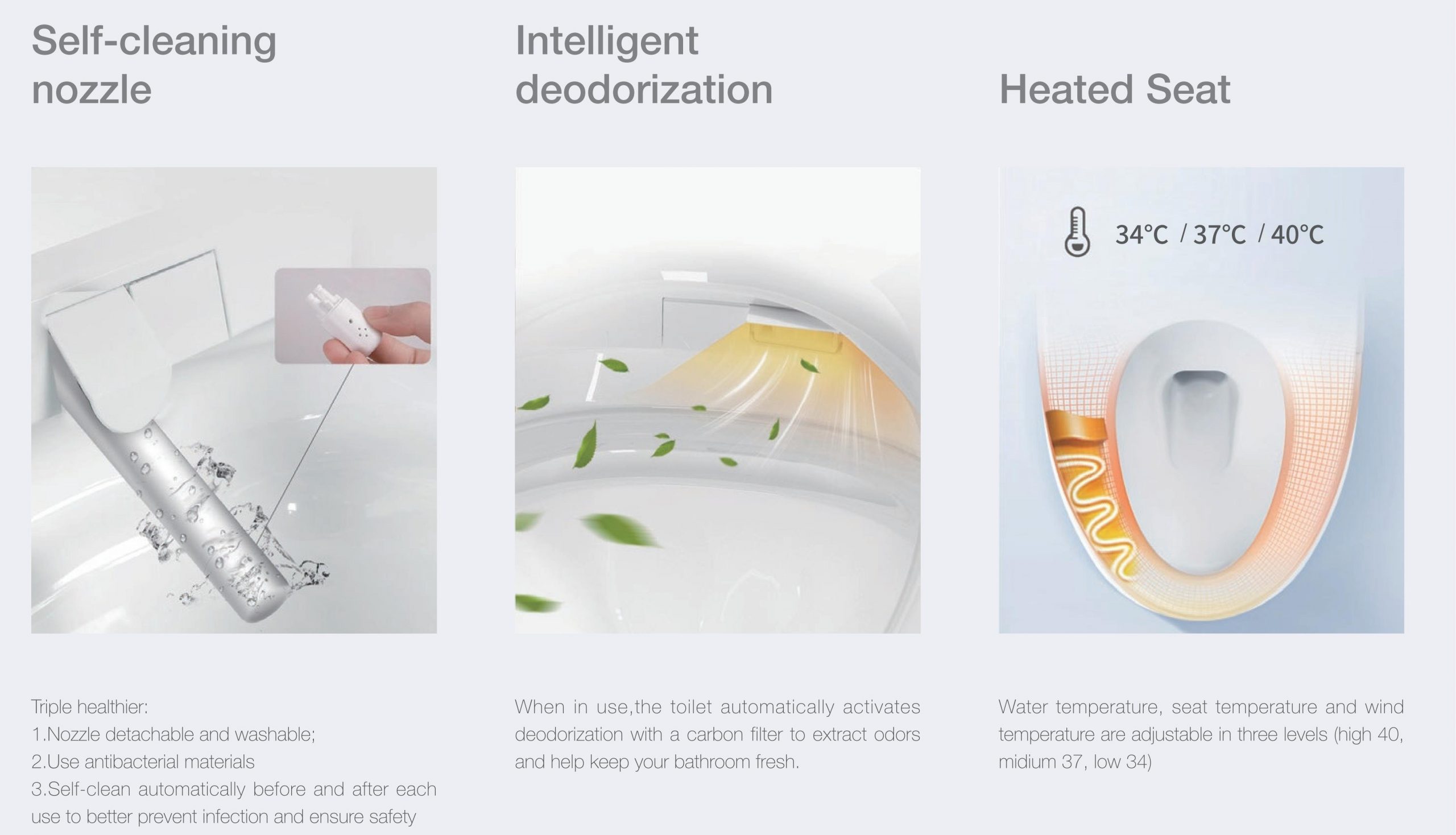 1. Posterior Wash: The special nozzle for buttocks washing sprays warm water to fully wash the buttocks.
